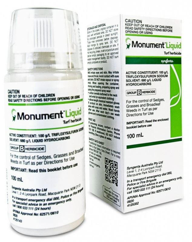 Monument Liquid Herbicide controls Burr Medic, Bindii, Ryegrass, Winter Grass, Catsear, Chickweed, Clover, Cotula, Creeping Oxalis, Curled Dock, Milk Thistle, Mullumbimby Couch and Nutgrass.